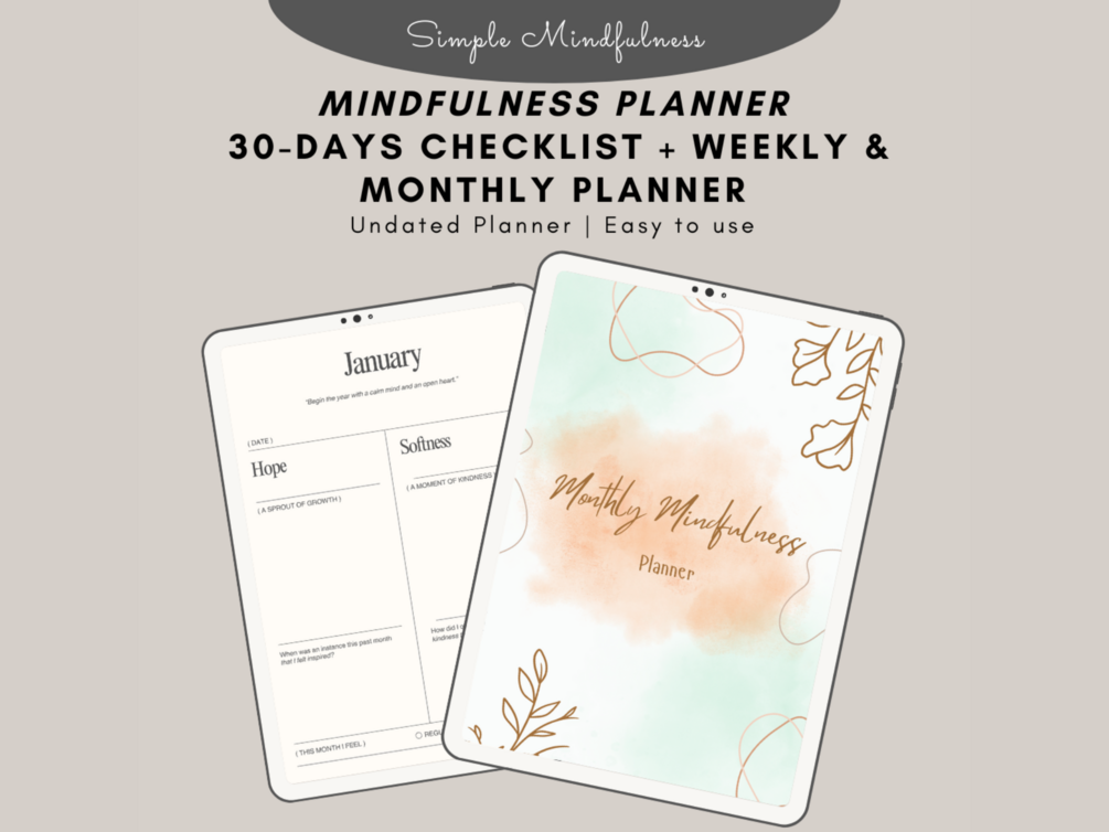 "Stay consistent with your mindfulness practice using this complete mindfulness planner printable bundle — includes a 30-day tracker, weekly layouts, and 12-month mindful living planners.”
